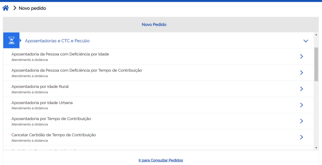 Vai aparecer a lista de serviços disponíveis, você vai clicar em “Aposentadorias e CTC e Pecúlio”. Depois, bastará selecionar a aposentadoria desejada.