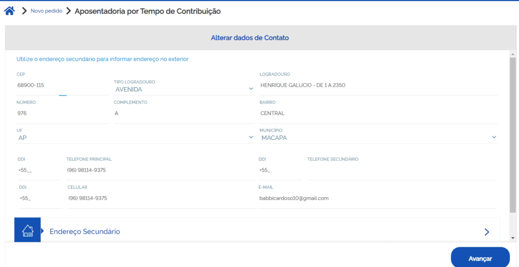 Logo após, você vai atualizar seus dados pessoais, caso tenha necessidade e apertar em avançar, confirmando as informações na tela.