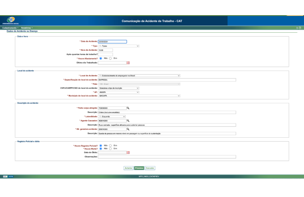 - Tipo da CAT: Selecione “Inicial” se você está registrando o acidente ou doença pela primeira vez.
