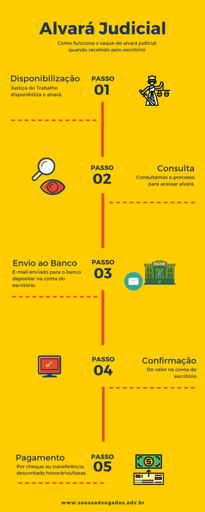É Bom saber que o seu valor não será disponibilizado imediatamente, pois o escritório enviará o Alvará para ao Banco, que levantará o valor para a conta jurídica do escritório, que, após confirmar o depósito, irá lhe pagar por intermédio de Cheque/transferência.