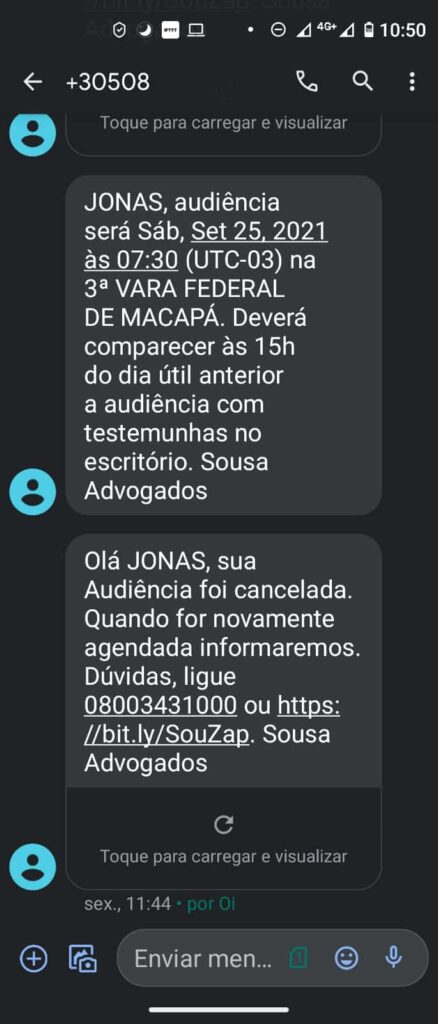 Será comunicado por mensagem de texto (sms) onde constará a data, horário e local da sua audiência ou perícia: