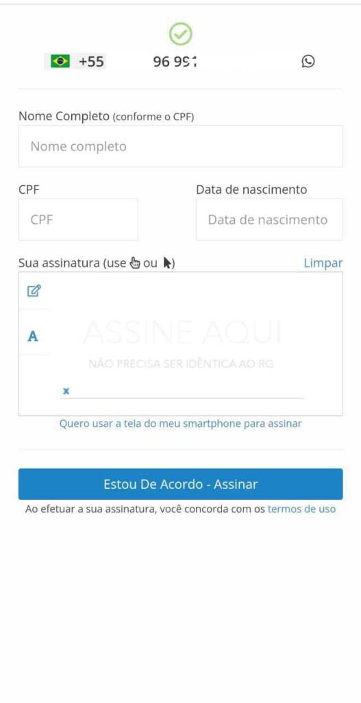 - Por fim, irá preencher com seu nome, CPF, data de nascimento e vai assinar com o seu celular ou cursor.
